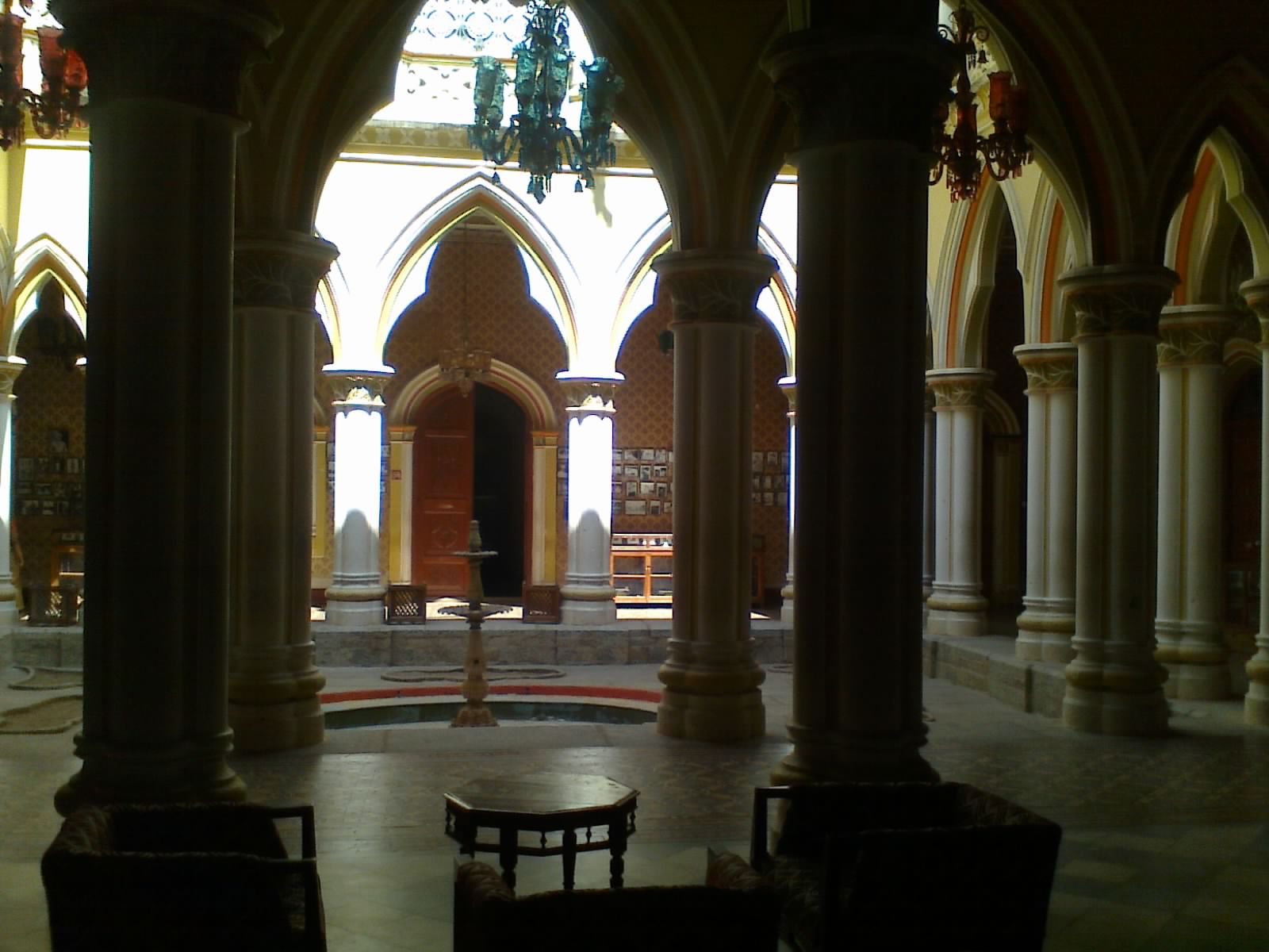 with stained glass windows, luxurious sofa sets and chandeliers.